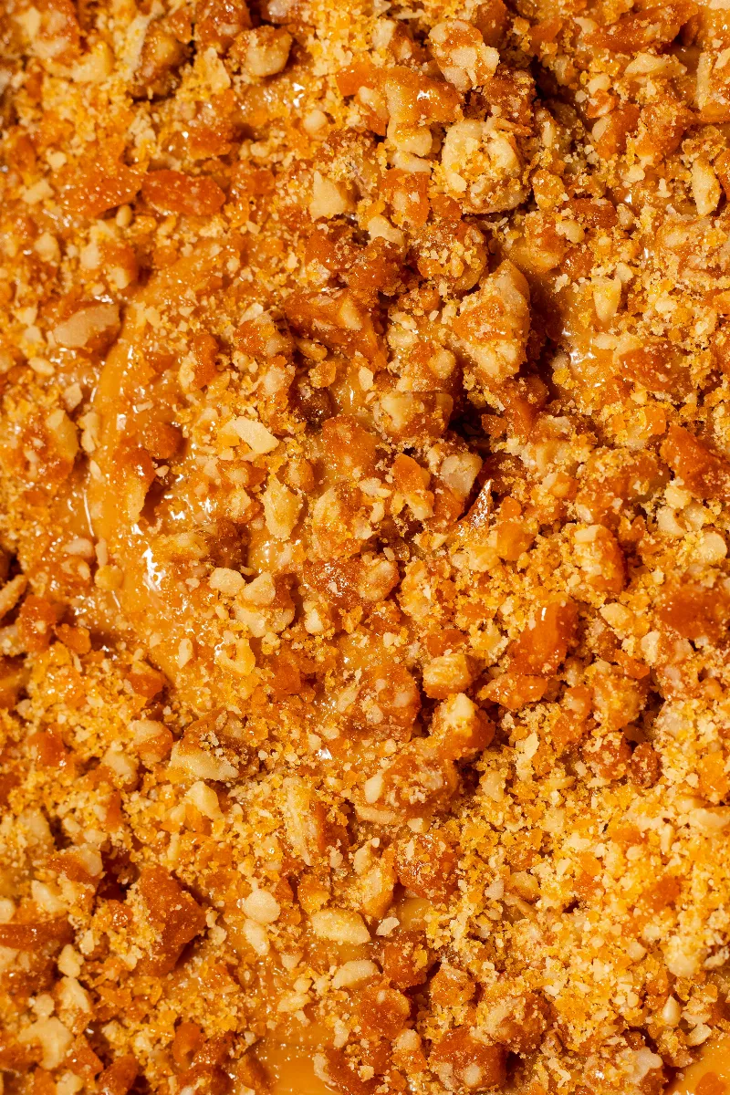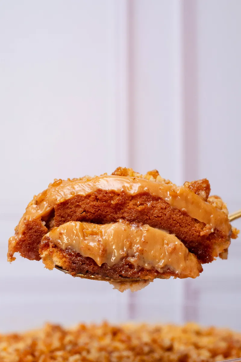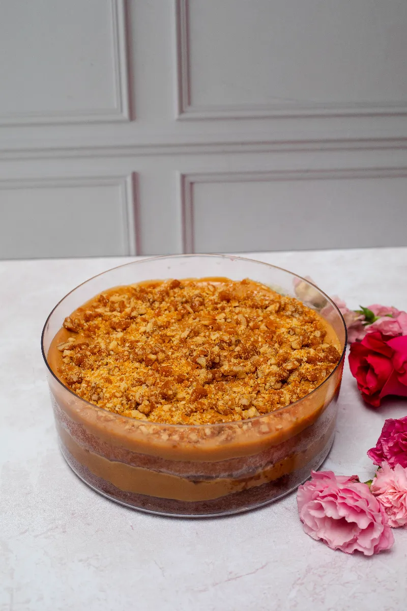 Massa de bolo fofinha e bem úmida com duas camadas generosas de doce de leite cozido e nozes crocantes pra dar o toque final.