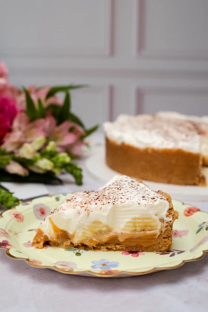 Massa de biscoito com manteiga, doce de leite cozido, banana nanica fatiada e creme de leite fresco batido para finalizar.