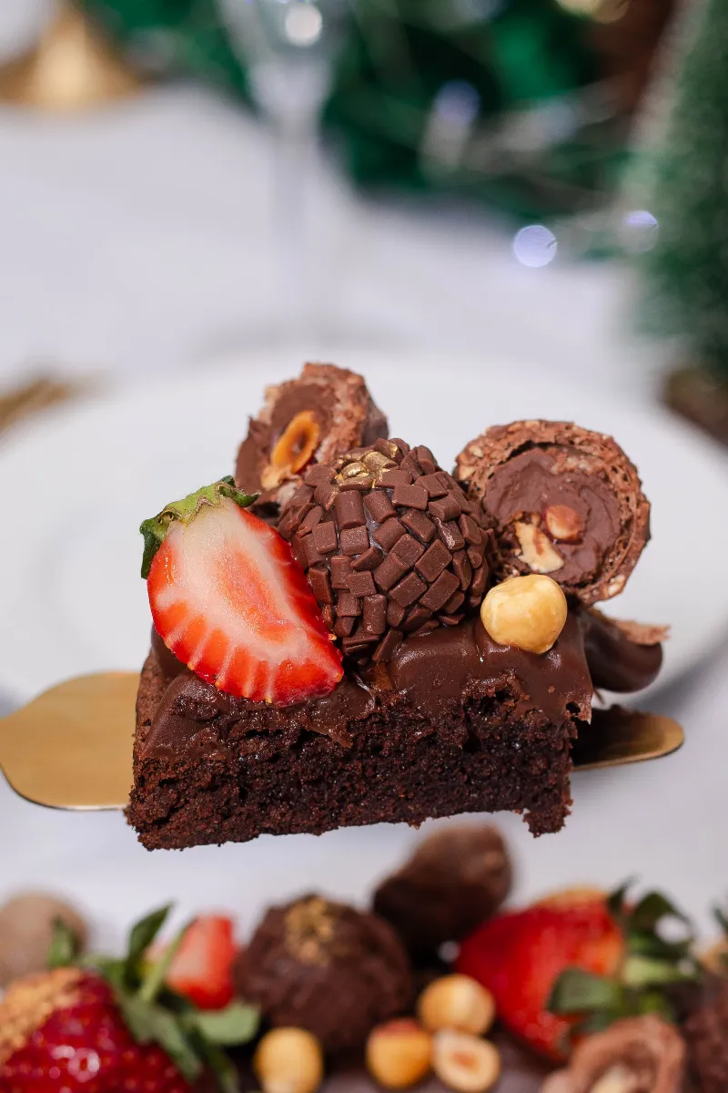 - Brigadeiro tradicional com pedaços de Ferrero Rocher, morangos frescos, avelãs e brigadeiros enrolados.