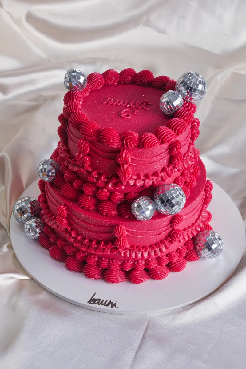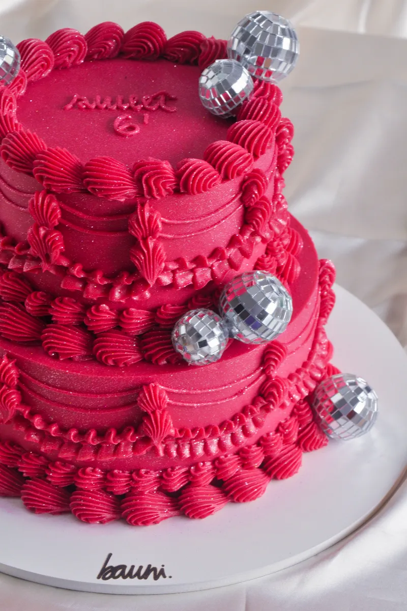 Bolo DE DOIS ANDARES, decorado em buttercream de merengue suíço e finalizado com disco balls. Obs: Caso deseje, inserir no campo "observações" a frase do bolo, ou informar caso não queira nada escrito. Peso aproximado: 2A -> 3kg; 2APLUS -> 4,5kg