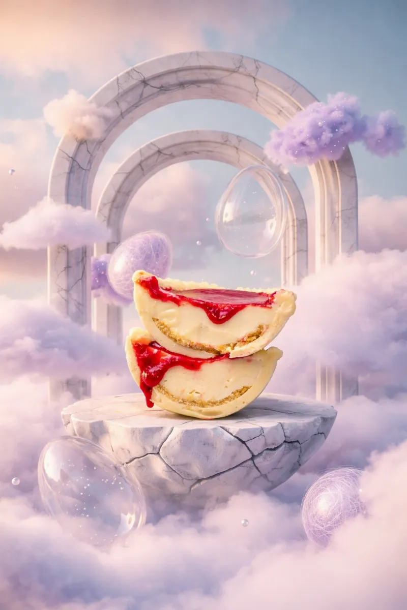 Casca de chocolate branco com base crocante de biscoito, ganache cremosa de cream cheese e gel de morango fresco. "P" pesa 290g. "G" pesa 390g.