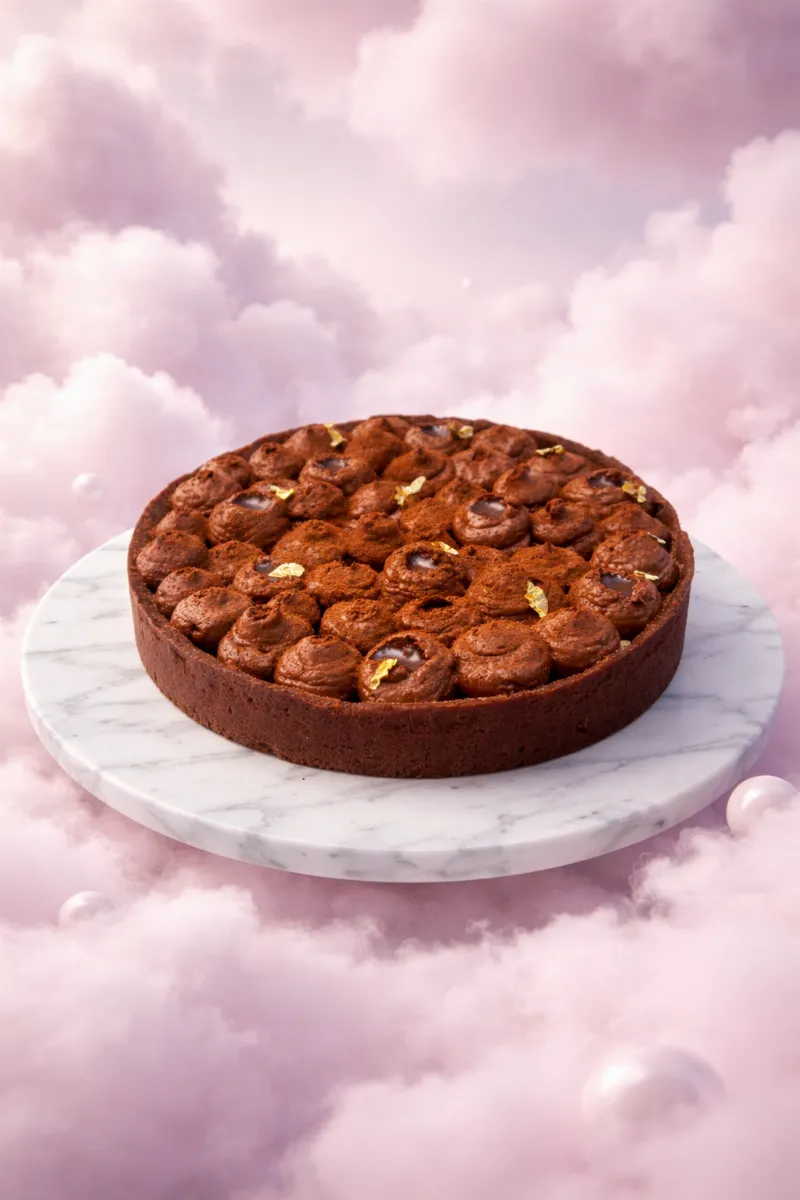 Sablé de cacau, crocante de chocolate, ganache de maracujá e mousse de chocolate no topo. Pesa 1,2kg.