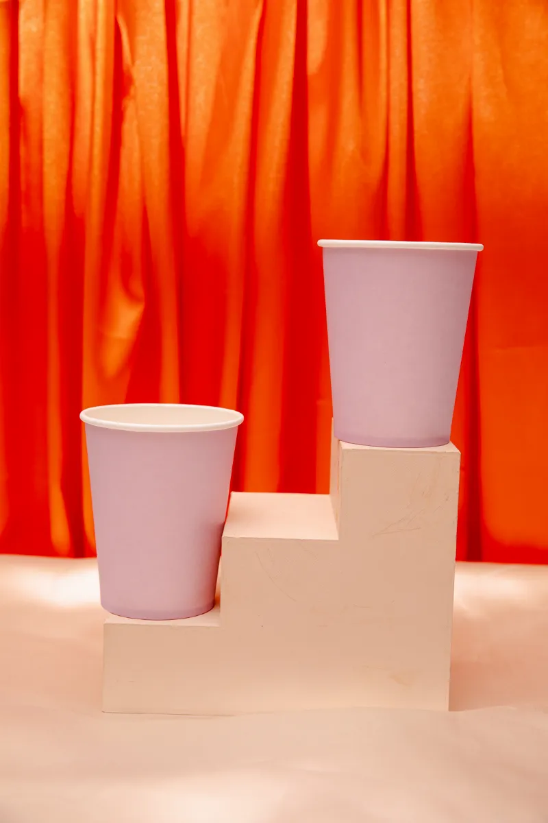 Oito unidades de copos de papel na cor lilás com capacidade para 220ml.
