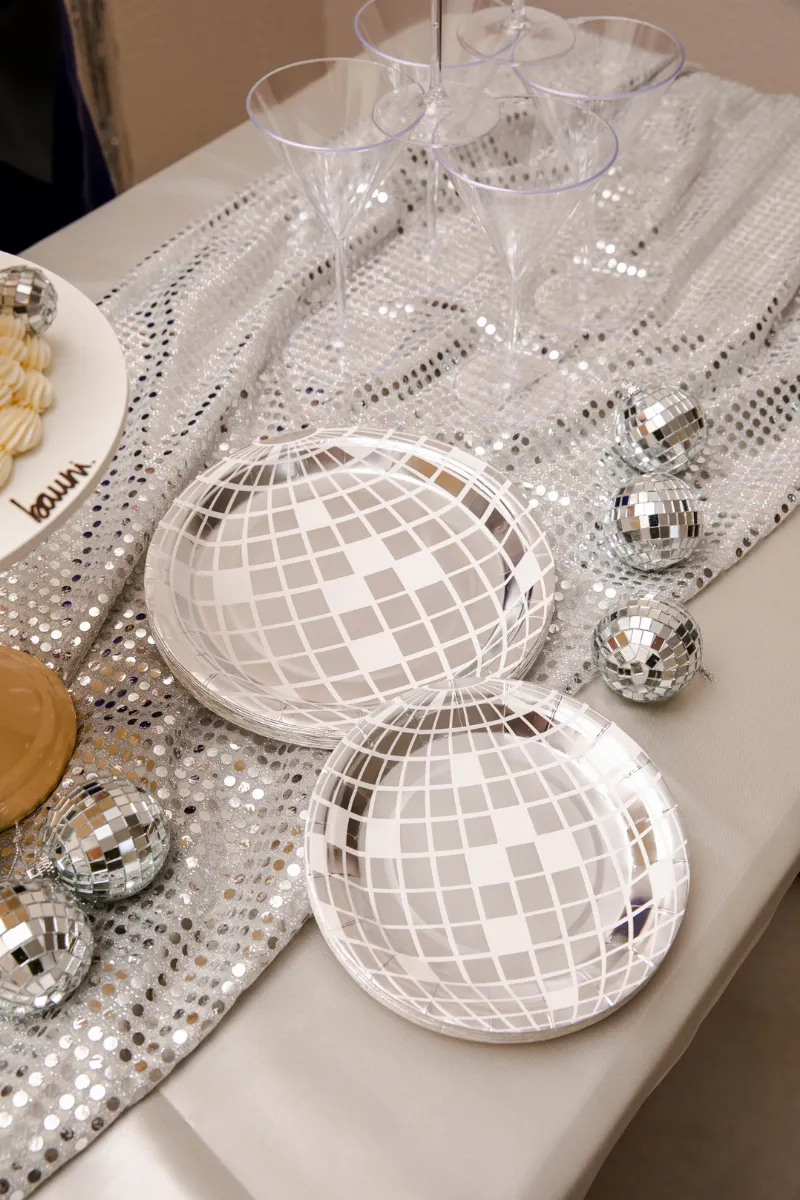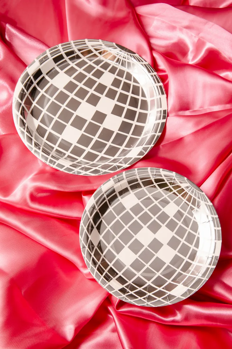 Prato de papel na cor prateada com tema "disco ball". Perfeito pra deixar sua festa ainda mais icônica!