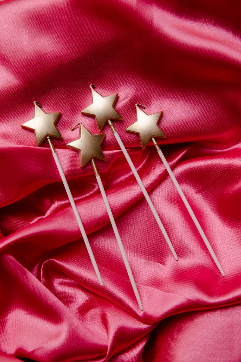Quatro velas em formato de estrela na cor dourada.Cada vela tem 14cm.*Imagens meramente ilustrativas, as cores podem variar de acordo com o monitor.*