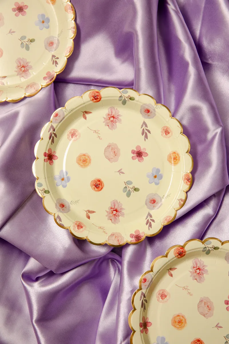 Conjunto de dez pratos com estampa floral delicada, pra dar um toque icônico pra decoração da sua festa.Os pratos possuem 18cm de diâmetro.*Imagens meramente ilustrativas, as cores podem variar de acordo com o monitor.*