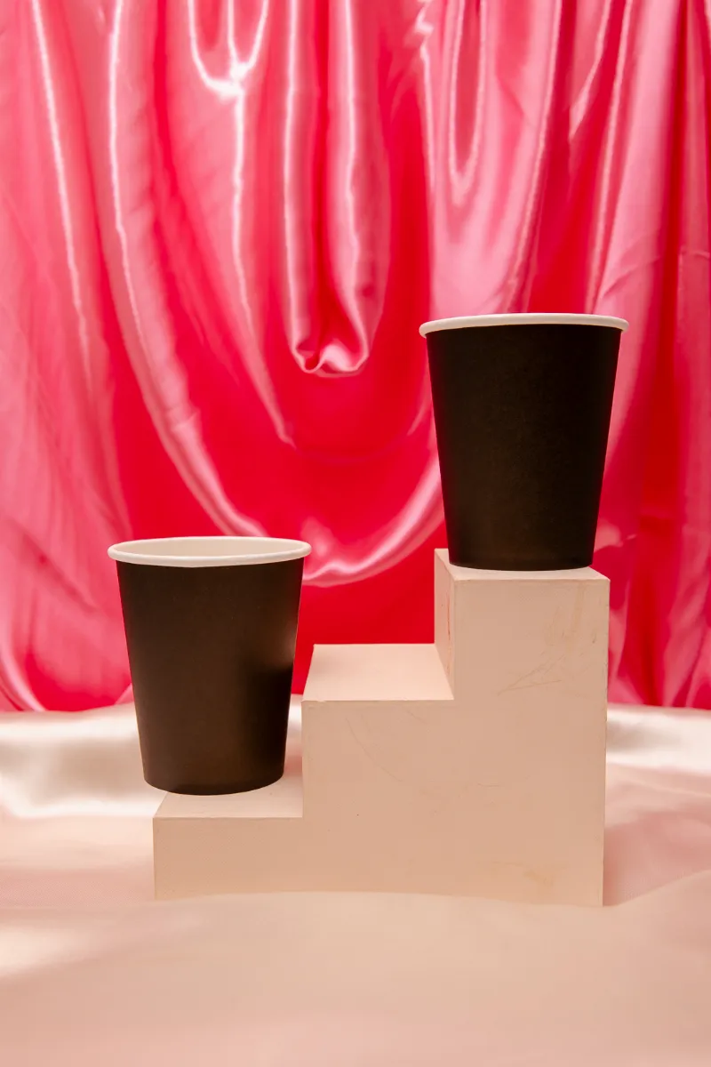 Dez unidades de copos de papel na cor preta com capacidade para 220ml.