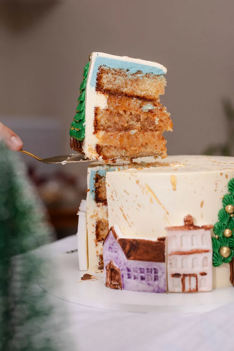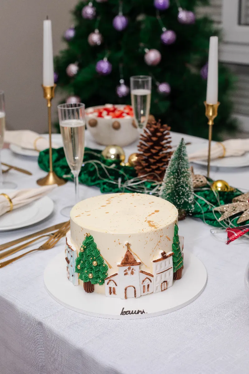 Bolo com decoração em pasta americana simulando uma vila natalina nas opções de sabores: